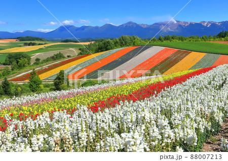 (北海道の絶景)四季彩の丘と大雪山系の山なみ