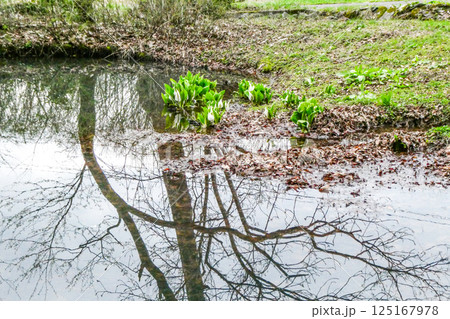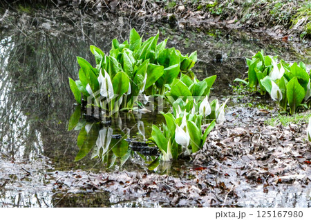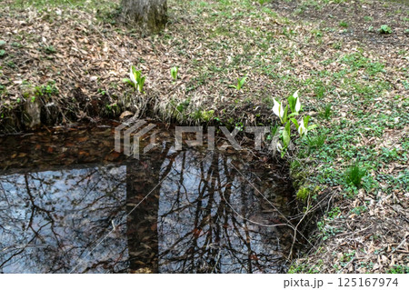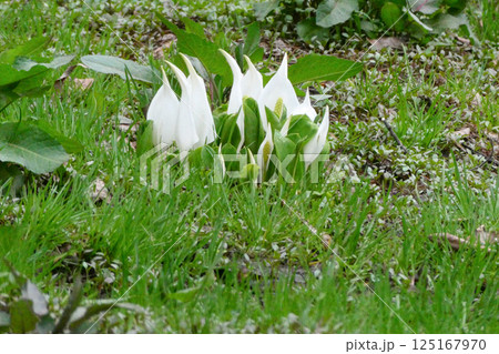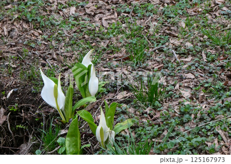 岩手県花巻に疎開した高村光太郎山荘の庭に咲いた水芭蕉の花