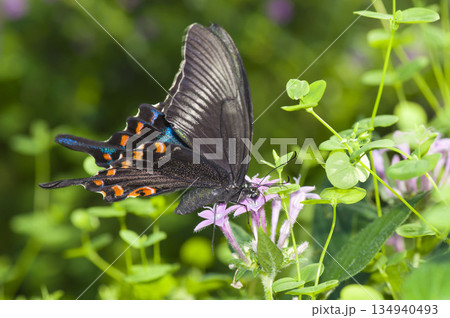 蓮の蕾にとまる青く輝く美しいチョウトンボ