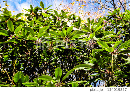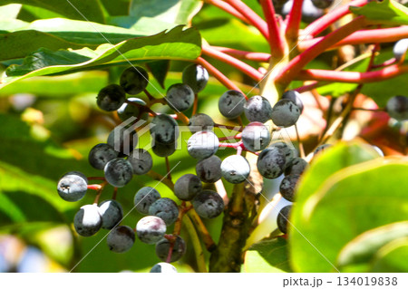 縁起物のユズリハの黒紫の実と厚い葉の葉柄は赤くてきれい 新芽が十分に成長すると下の葉が譲るように落ち