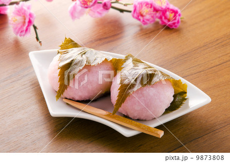 春の和菓子桜餅_長命寺餅_ピンクの背景