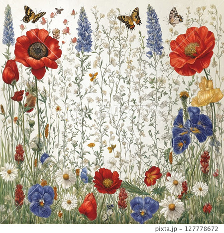 Delicate floral pattern with butterflies and wildflowers on an off-white background