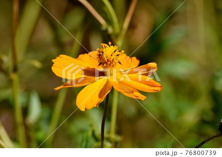 調布市深大寺元町の植物園に咲くオレンジ色のキバナコスモスの花