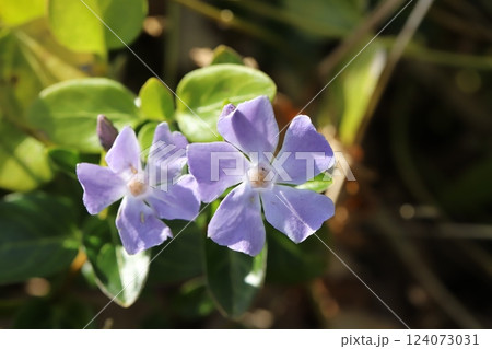 早春の庭に咲く薄紫色のツルニチニチソウの花