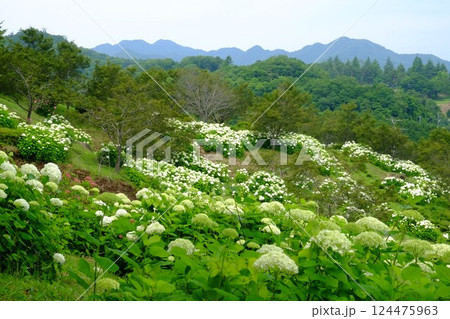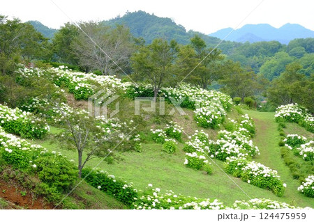 アナベル咲く公園と山並み 【相模原市津久井 6月】