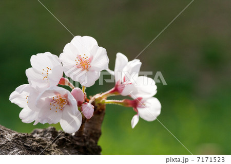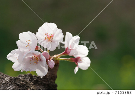 ソメイヨシノ桜の大樹の幹に愛らしい花枝と黄茶色の樹皮背景(自然環境下マクロ撮影)