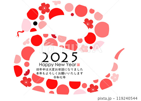 可愛いヘビと和の花のイラストの年賀状素材3_横