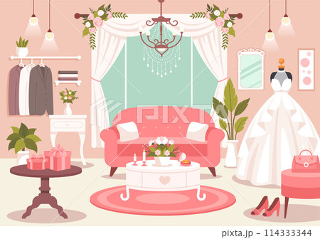 Wedding Shop Vector Illustration with Lover Looking for Jewellery, Beautiful Bride Gowns and Accessories to Get Married in Flat Cartoon Background