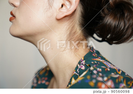 花柄ガウンを着たアップスタイルの女性