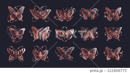 Shiny y2k butterflies. Cartoon abstract y2k aesthetic flying insect, glisten foil butterfly silhouettes flat vector illustration. Butterfly decor collection