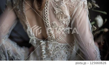 Elegant lace dress with intricate details, perfect for special occasions. Sophisticated and timeless.