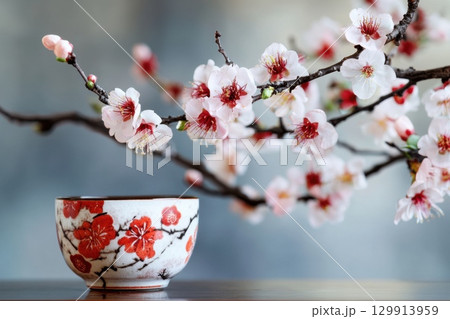 Cherry blossom branch and decorated ceramic cup on wooden surface. World Sake Day