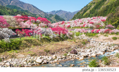 埼玉県秩父郡東秩父村大内沢 早春の里山の斜面に花桃が咲き乱れる「花桃の郷」の早咲き桜並木