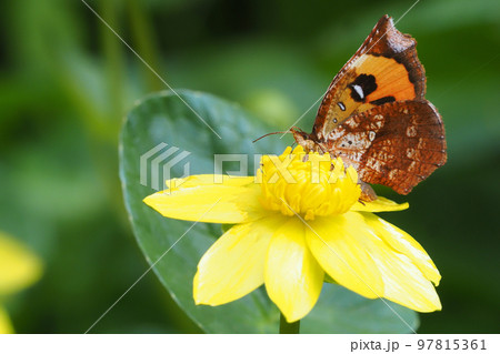 ヒメリュウキンカの花を吸蜜中のイカリモンガ