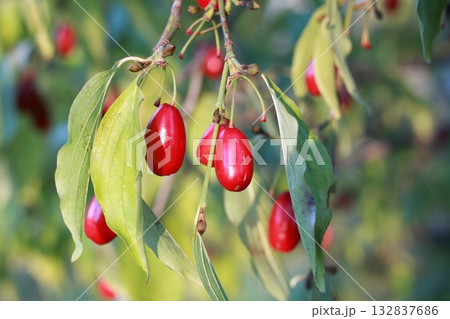 Red ripe cornellian cherry, lat. Cornus mass in the autumn.