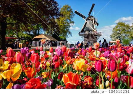 Blooming tulips flowerbed and wind mill in Keukenhof garden, aka the Garden of Europe, one of the world largest flower gardens windmill tourists. Lisse, Netherlands