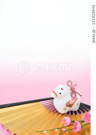 午年 年賀素材 白午の干支飾りと金扇子と梅の花