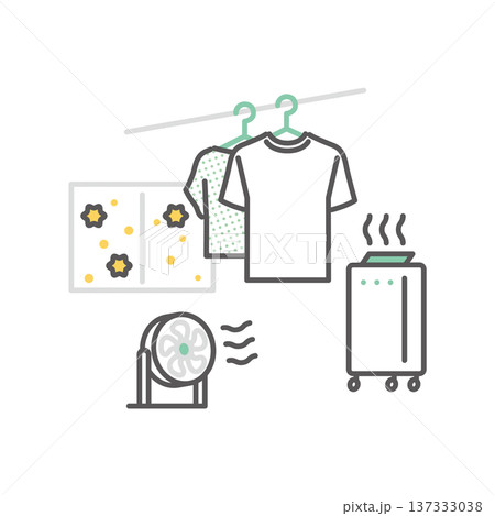 シンプル イラスト 花粉症対策の家電と室内干し洗濯物のイラストのイメージ ベクターイラスト