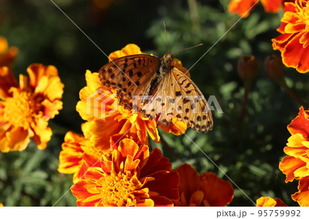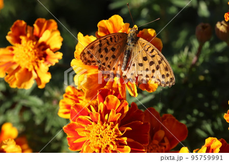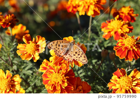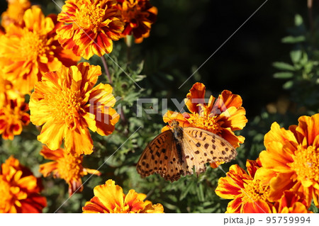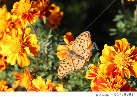 日本の秋の庭に咲く橙色のマリーゴールドの花の蜜を吸うツマグロヒョウモンのオス