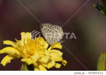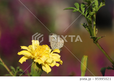 日本の秋の庭に咲く黄色いマリーゴールドの花の蜜を吸うヤマトシジミ蝶