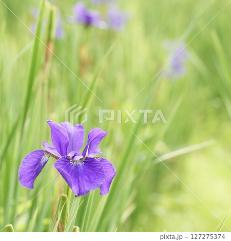 初夏に咲く紫色の花 アヤメ ふんわり緑背景