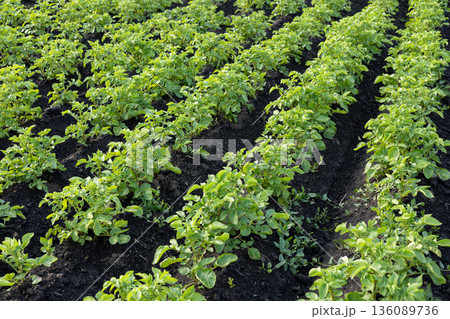 Lush potato plants grow in organized, neat rows, soaking up sunlight under a bright blue sky during summer