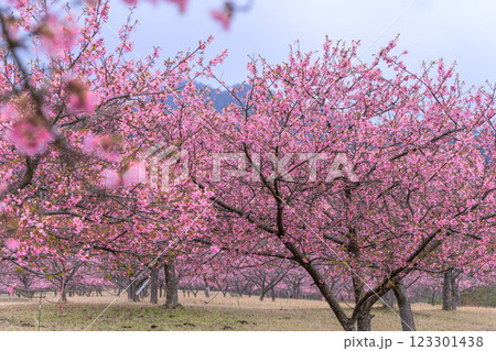 (阿蘇山)青空を背景に映える河津桜風景(南阿蘇)熊本県野外劇場アスペクタ