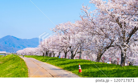 〈島根県〉斐伊川堤防 満開の桜並木を歩く人