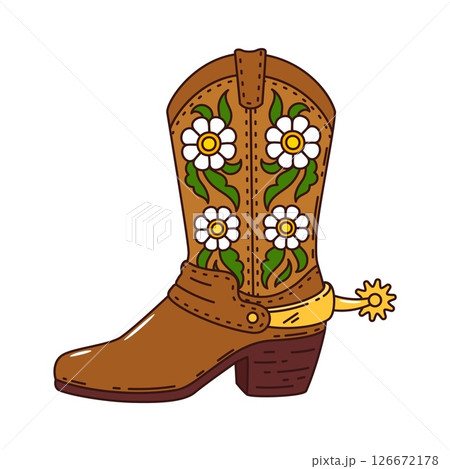 Cowboy boot groovy western, wild west hippie item. Isolated vector rugged leather footwear, features high, angled heel, pointed toe, spur and floral pattern, embodying American ranch frontier spirit