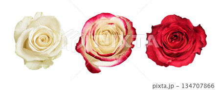Set of red and white rose flowers isolated on white background. Top view.