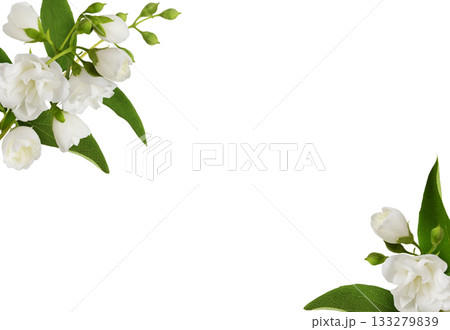 Small bouquets of Jasmine (Philadelphus) flowers in corner arrangements isolated on white