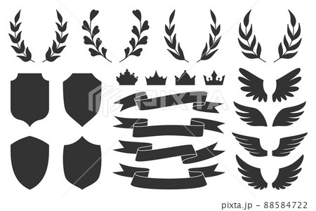 Shield wreath ribbon crown wing black stamp silhouette set. Ceremonial signage object label template medieval defense quality assurance prize letter royal ad expensive decoration badge award isolated