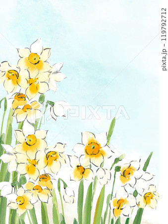 水彩で描いた青空をバックに配したスイセンの花【手描き】コピースペースあり