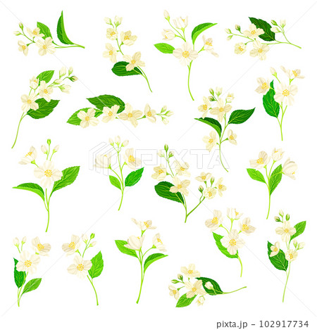 Jasmine Plant Species with Fragrant White Flowers and Pinnate Leaves Big Vector Set