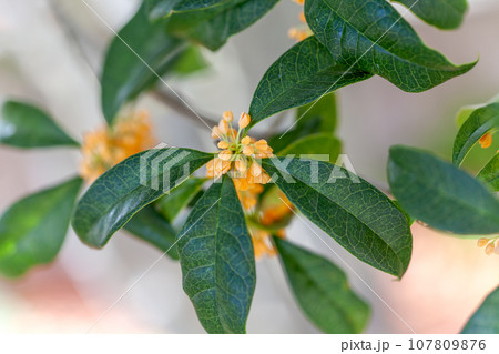 Osmanthus fragrans macro. Small white flowers on a branch in the garden selective focus. The fragrance of osmanthus flowers is used in perfumery.