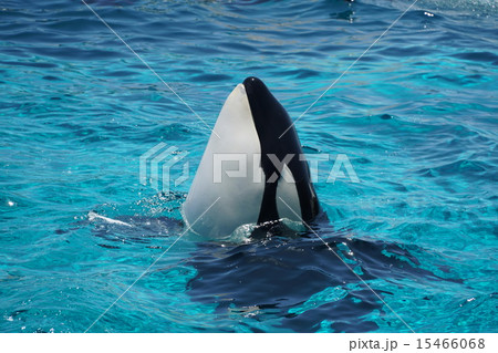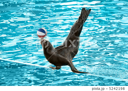 前ひれ1つでプールサイドのステージ台の上で芸をする水族館のショーの風景