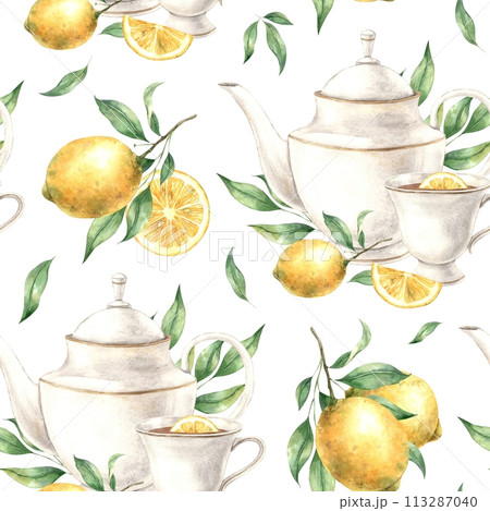 Watercolor tea pattern with ceramic tableware and fresh lime on a white background. Illustration is hand drawn, suitable for menu design, packaging, poster, website, textile, invitation, brochure.