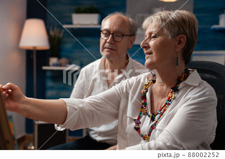 Senior couple drawing using pencil on canvas sitting down in front of easel with canvas in home art studio. Old retired man and woman creative artists talking about charcoal sketch in workshop.