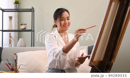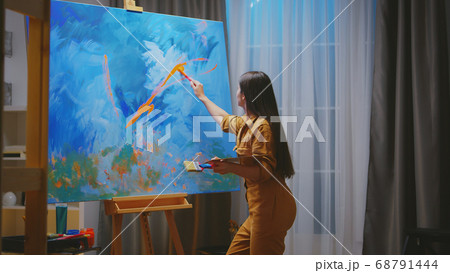 Cute woman paints on canvas in an art workshop. Artist creating picture. Art school or studio. Work with paints, brushes and easel. Hobby and leisure concept. Woman painter at workspace