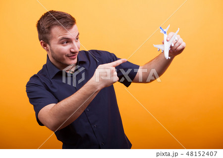 Young man holding a toy plane in blue shirt over yellow background