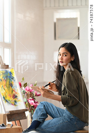 Photo of young beautiful artist holding a paint brush and drawing on painting canvas while sitting next to the arts accessories putting on small wooden table with studio windows as background.