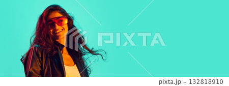 Happy woman in visor glasses with loose hair smiling in turquoise light. Banner