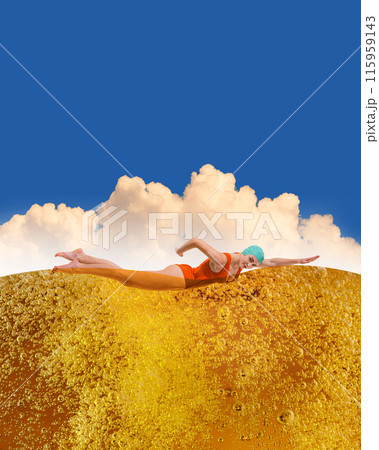 Poster. Contemporary art collage. Young woman in swimwear, swimming in sparkled, golden colored ocean of beer. Summertime.