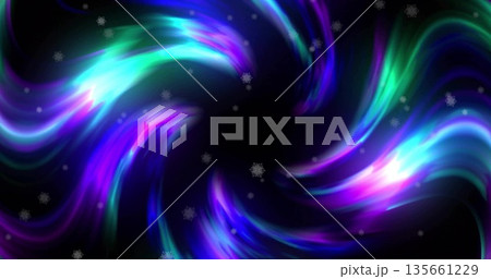 Swirling neon light vortex forming in digital space, with glowing trails and snowflake particles