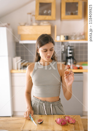 A young woman is attentively preparing a variety of exotic and colorful fruit in her modern kitchen