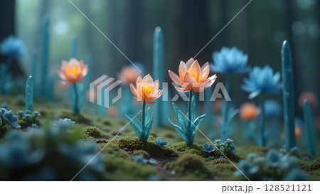 Mystical floral garden illuminated by ethereal light showcasing translucent blossoms and towering crystal formations in a serene and otherworldly landscape setting creating a fantasy dream