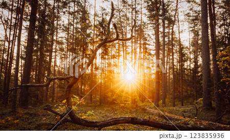 Sunlight Sunrays Shine Through Fallen Tree Trunk. Beautiful Sunset Sun Sunshine In Sunny Autumn Coniferous Forest. Autumn Season. Sunset Sunrise In Summer Forest Trees. Bright Sunshine