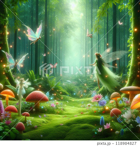 A magical forest filled with glowing fairies, vibrant mushrooms, and fluttering butterflies