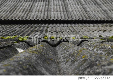Old and covered with moss wavy roof slates covers the barn in cloudy sky background