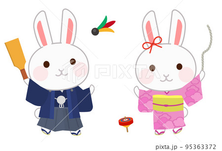 卯年 羽根付きとコマ遊びをする兎 正月素材 イラスト
